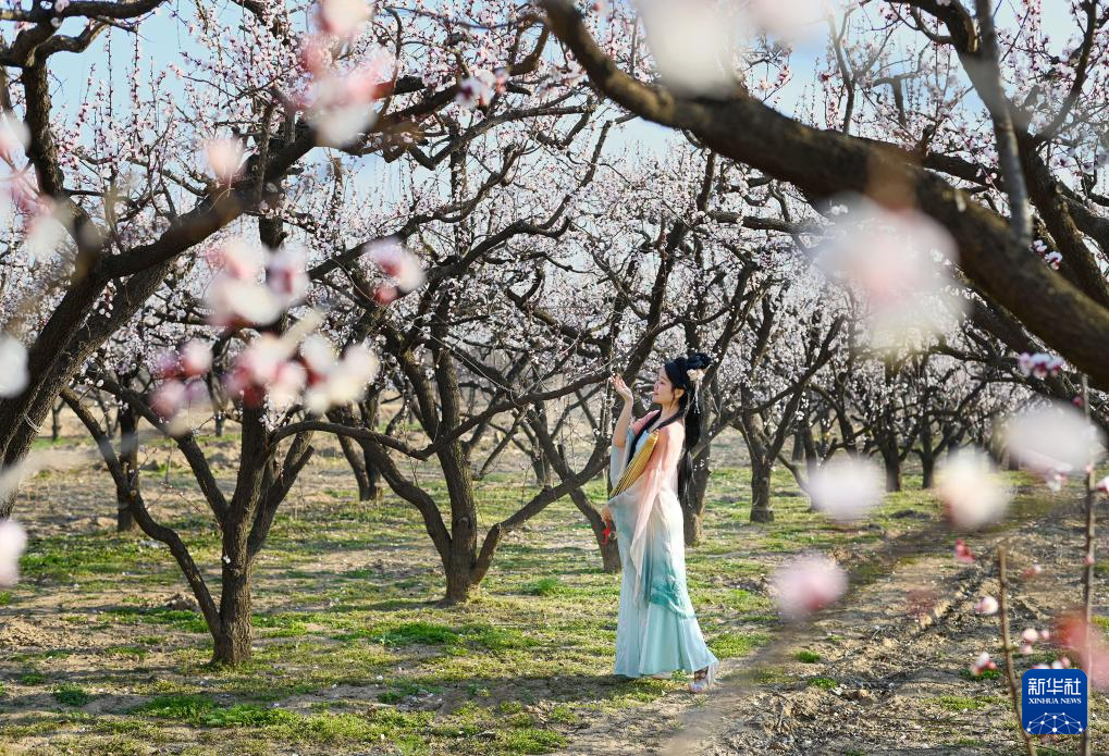 3月20日,游客在安徽省宿州市砀山县玄庙镇杏园里游览拍照。