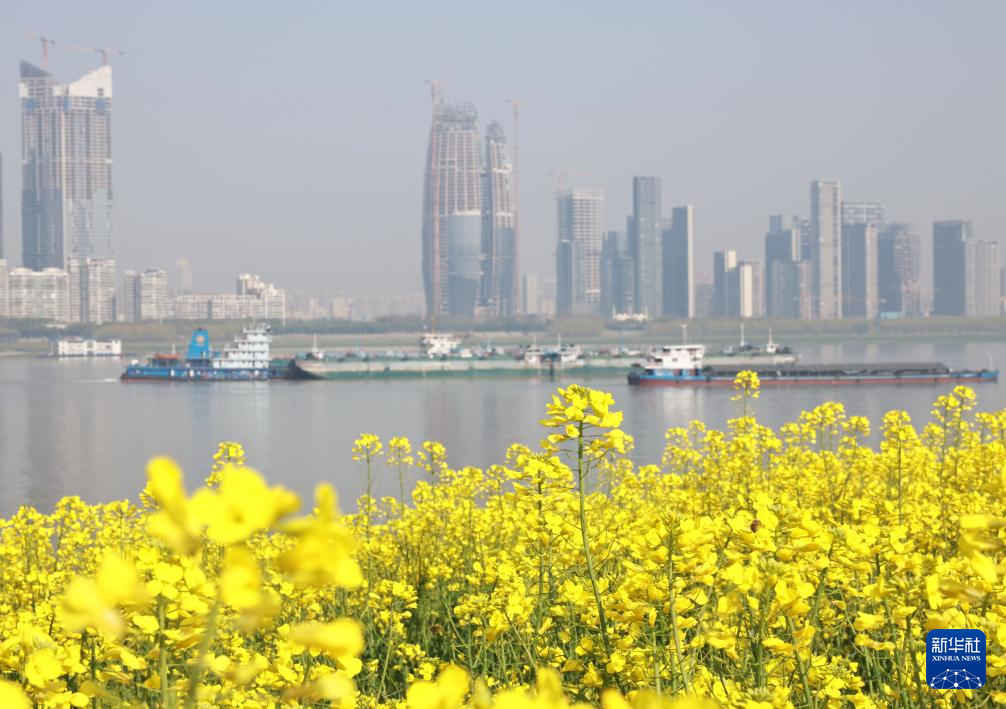 3月20日,船舶驶过湖北省武汉市长江岸边的油菜花田。