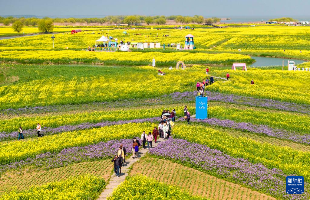 3月20日,游客在江苏省高邮市湖上花海景区赏花游玩(无人机照片)。