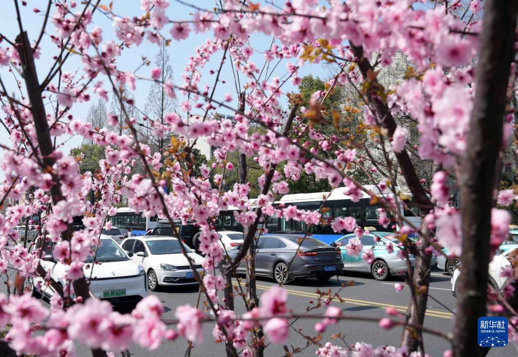 3月20日,车辆驶过杭州市玉古路边的樱花树。