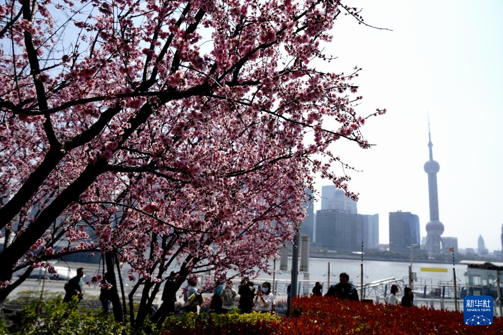 3月20日,人们在上海北外滩踏青赏花。