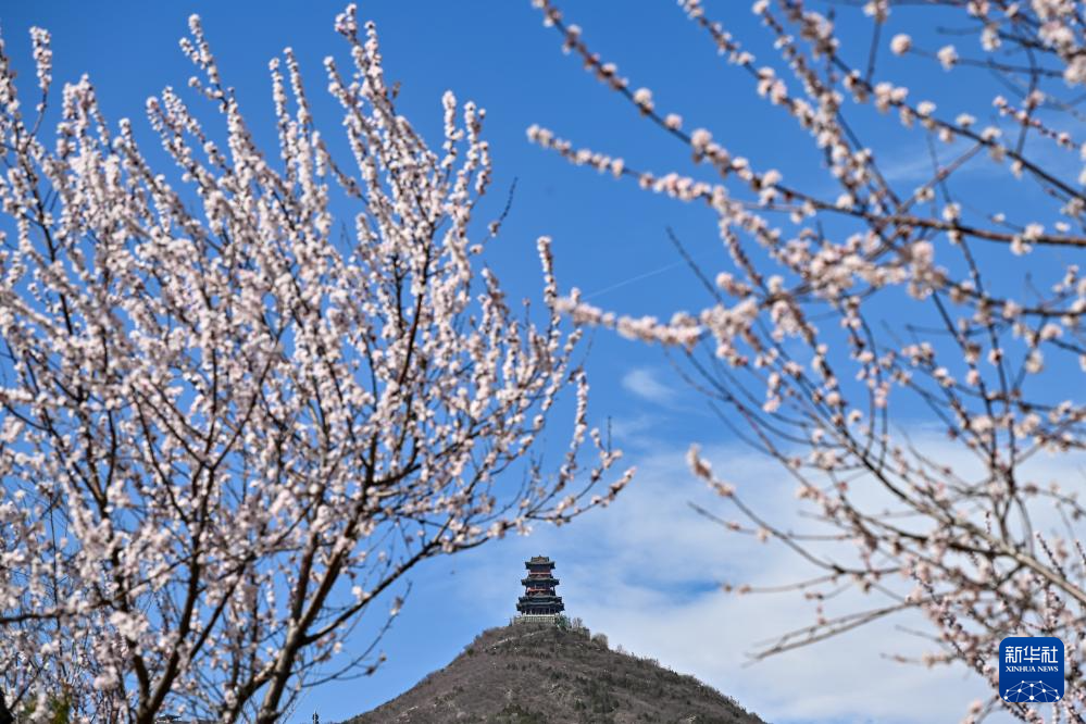 3月20日,盛放的春花与北京门头沟区定都阁相映成趣。