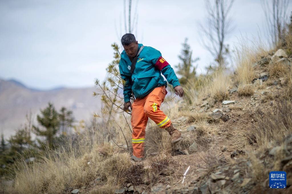 扎西曲培在南山公园查看树木长势(2025年3月20日摄)。