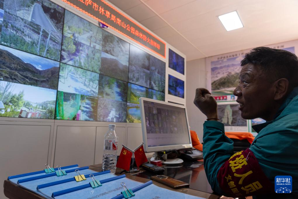 扎西曲培在监控室查看南山公园各处情况(2025年3月20日摄)。