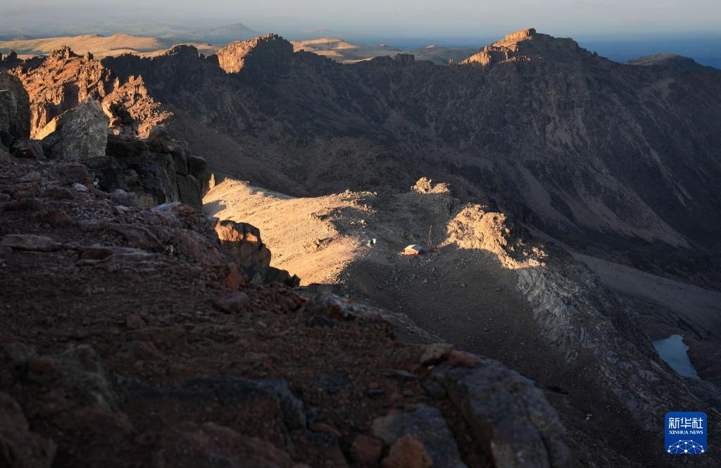 这是3月15日在肯尼亚山第三高峰莱纳纳峰拍摄的晨光里的奥地利小屋。奥地利小屋是登顶肯尼亚山前的住宿营地之一。