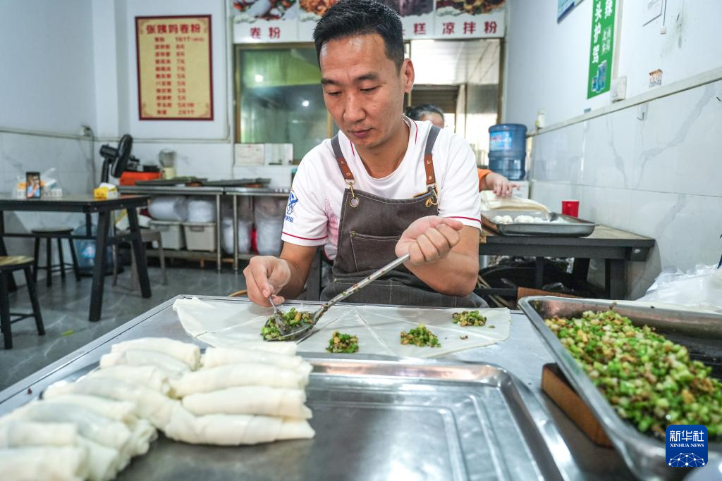 董永恒在榕江县亲戚家的卷粉店制作卷粉(3月27日摄)。
