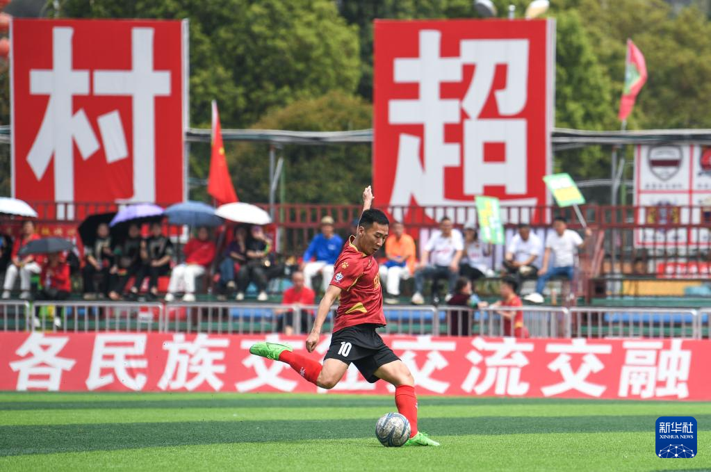 董永恒在2025年贵州“村超”40强交叉赛忠诚村队与章鲁村队的比赛中发定位球(3月23日摄)。