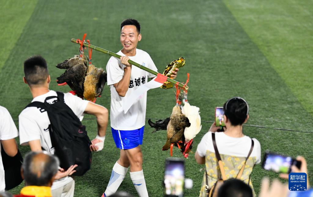 在2023年“村超”总决赛颁奖仪式上,董永恒展示获得的最佳射手金靴奖杯和奖品——榕江小香鸡(2023年7月29日摄)。