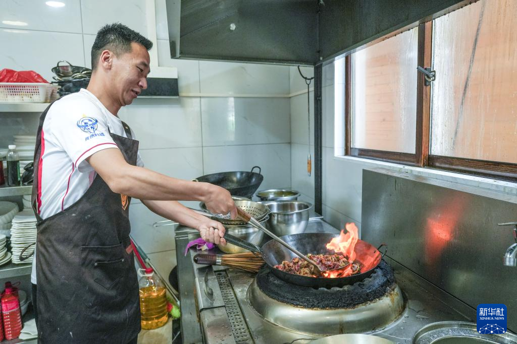 董永恒在榕江“村超”美食根据地餐馆为顾客炒制牛瘪(3月27日摄)。