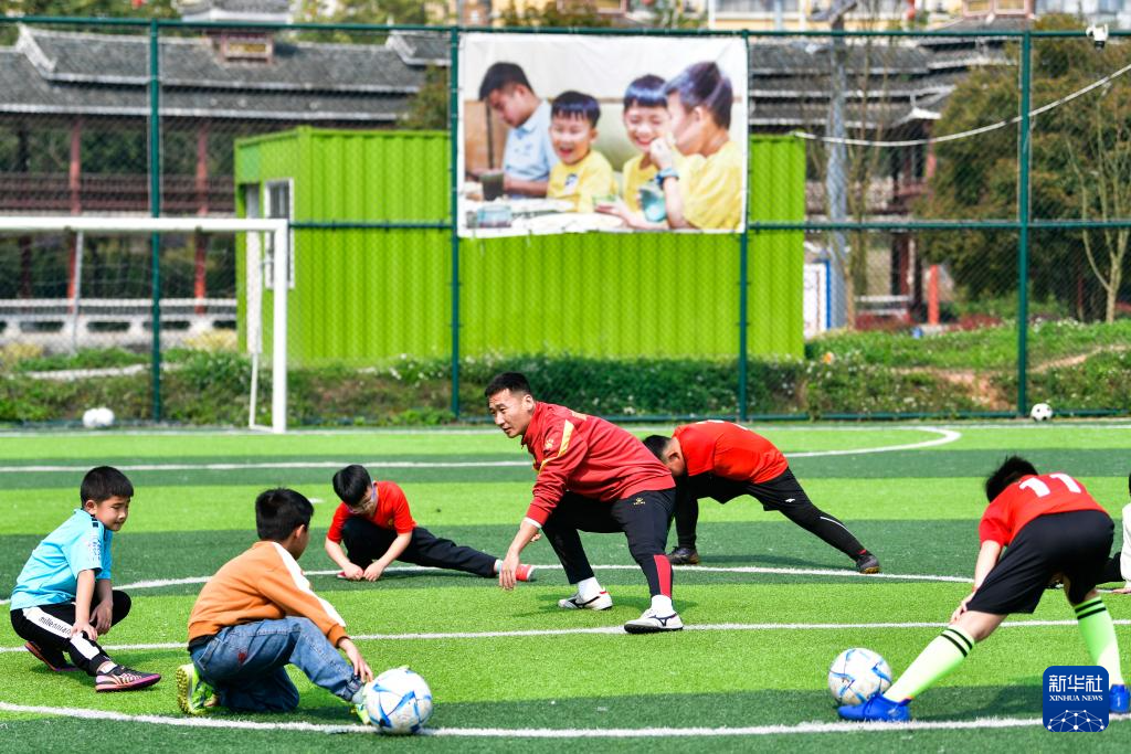 董永恒(左五)为榕江县的孩子进行足球基本功培训(3月23日摄)。