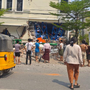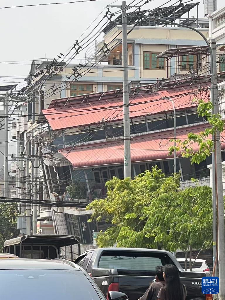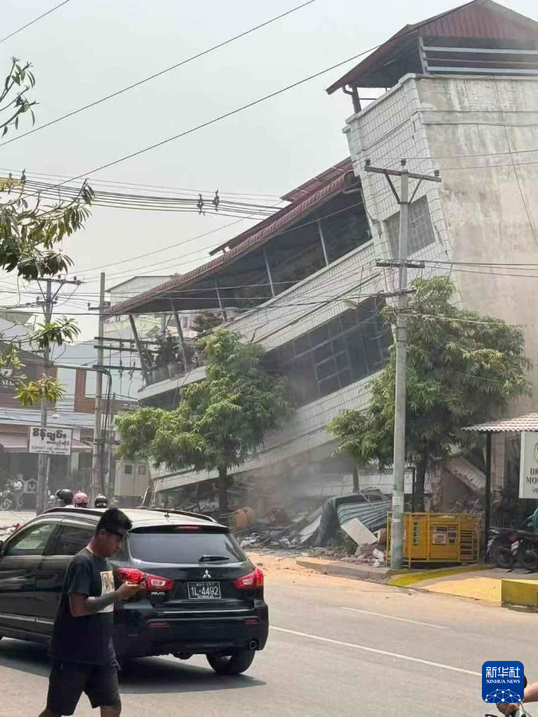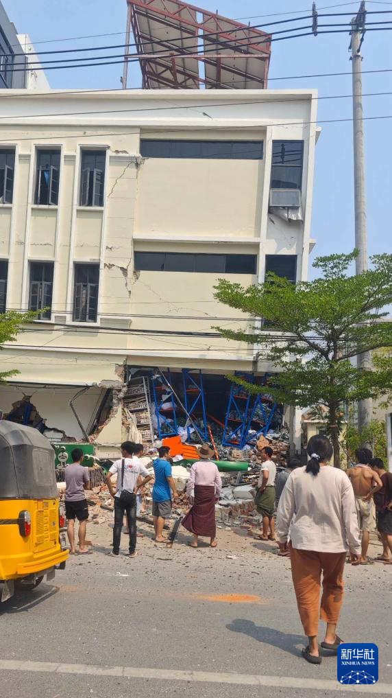 这是3月28日在缅甸曼德勒省拍摄的地震后受损的建筑(手机照片)。