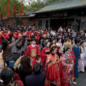 3月29日,婚礼方阵的巡游队伍通过阆中古城汉桓侯祠。