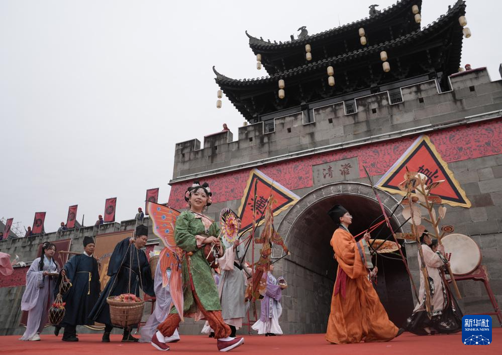 3月29日,非遗货郎方阵的巡游队伍在阆中古城澄清门展演。