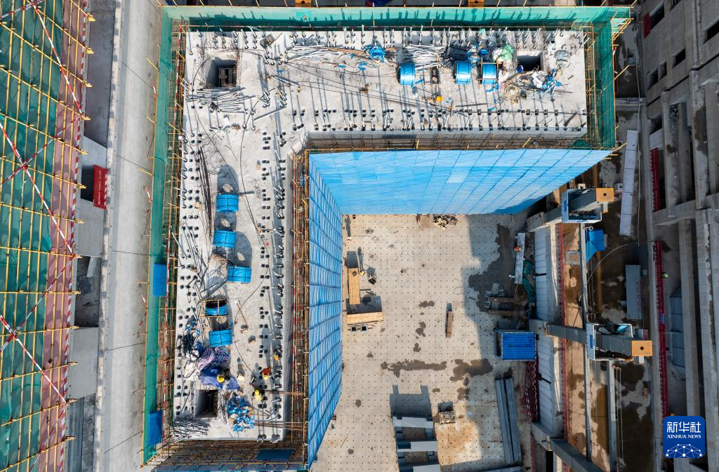 4月1日,工人在哈工大(深圳)重点实验室集群项目的结构静力大厅反力墙上施工(无人机照片)。