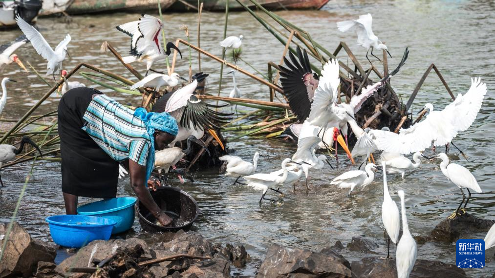 4月3日,在肯尼亚基苏木,商贩在维多利亚湖畔的鱼市外清洗鱼。