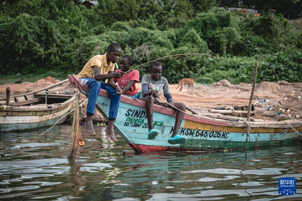 4月3日,在肯尼亚基苏木,孩子们在维多利亚湖畔钓鱼。