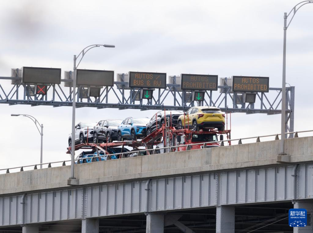 4月9日,在加拿大安大略省尼亚加拉瀑布市加美边境地带,一辆满载的汽车运输车通过刘易斯顿-昆斯顿桥开往加拿大。