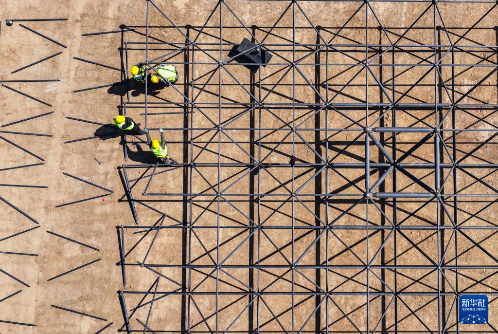 4月10日,工人在乌玛高速惠农至石嘴山段施工现场安装收费站顶棚(无人机照片)。