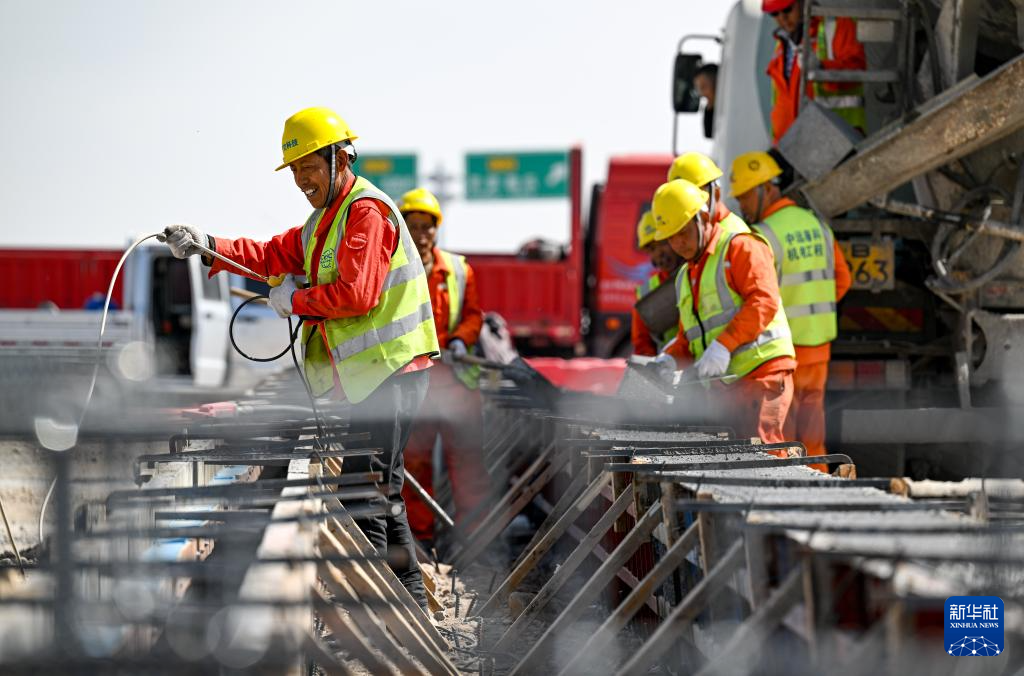 4月10日,工人在乌玛高速惠农至石嘴山段建设收费站。