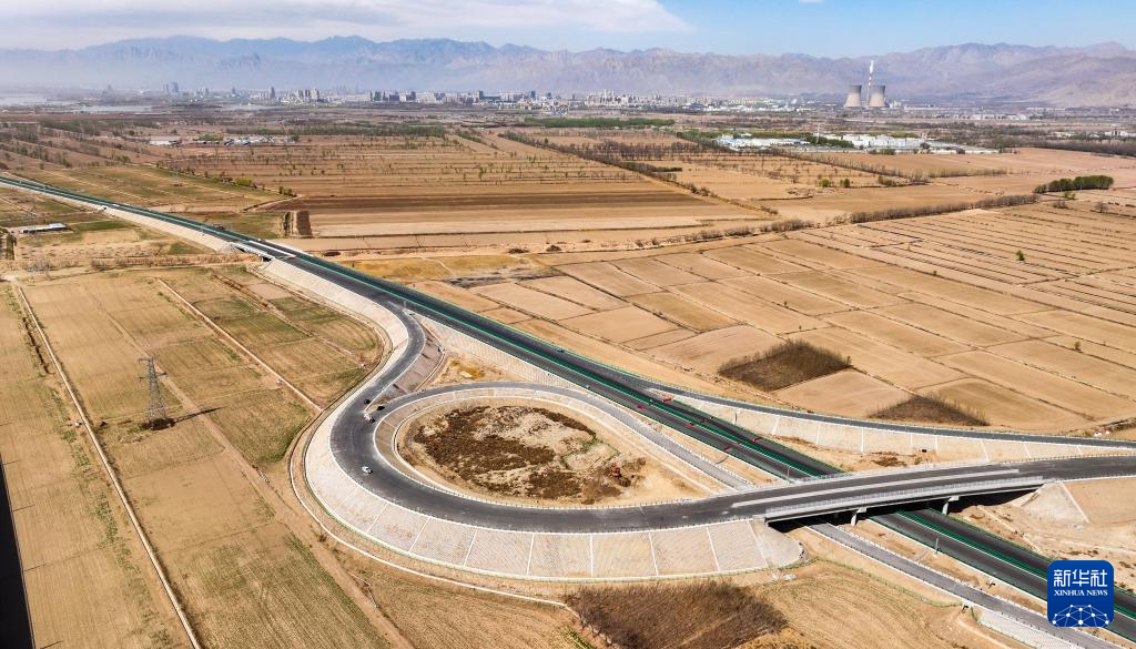 这是建设中的乌玛高速石嘴山互通(4月10日摄,无人机照片)。