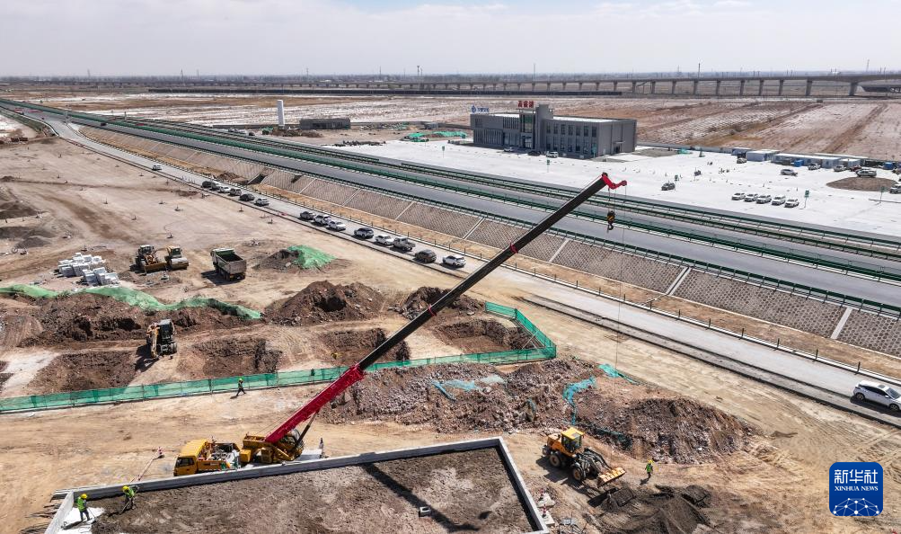 这是乌玛高速惠农至石嘴山段高庙湖服务区施工现场(4月10日摄,无人机照片)。