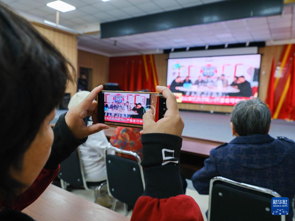 4月11日,在内蒙古兴安盟科尔沁右翼中旗巴彦呼舒镇西日嘎嘎查,村民在观看“村闻联播”节目。