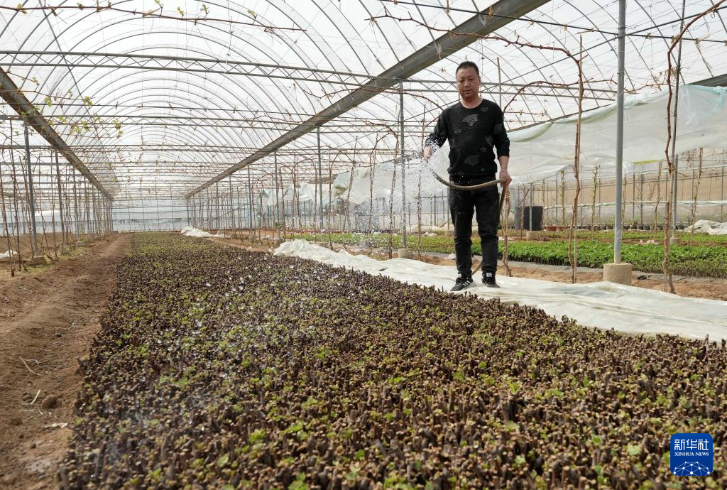 4月10日,昌黎县十里铺乡耿庄村的果农在大棚内给葡萄秧苗浇水。