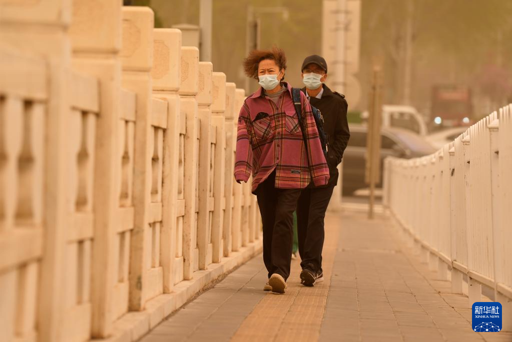 4月11日,在银川市街头,市民在强沙尘暴天气中行走。