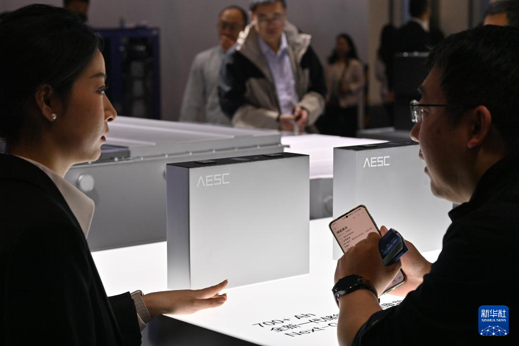 4月11日,参观者(右)在第十三届储能国际峰会暨展览会上了解远景储能展出的全新一代700+Ah大容量储能电芯。