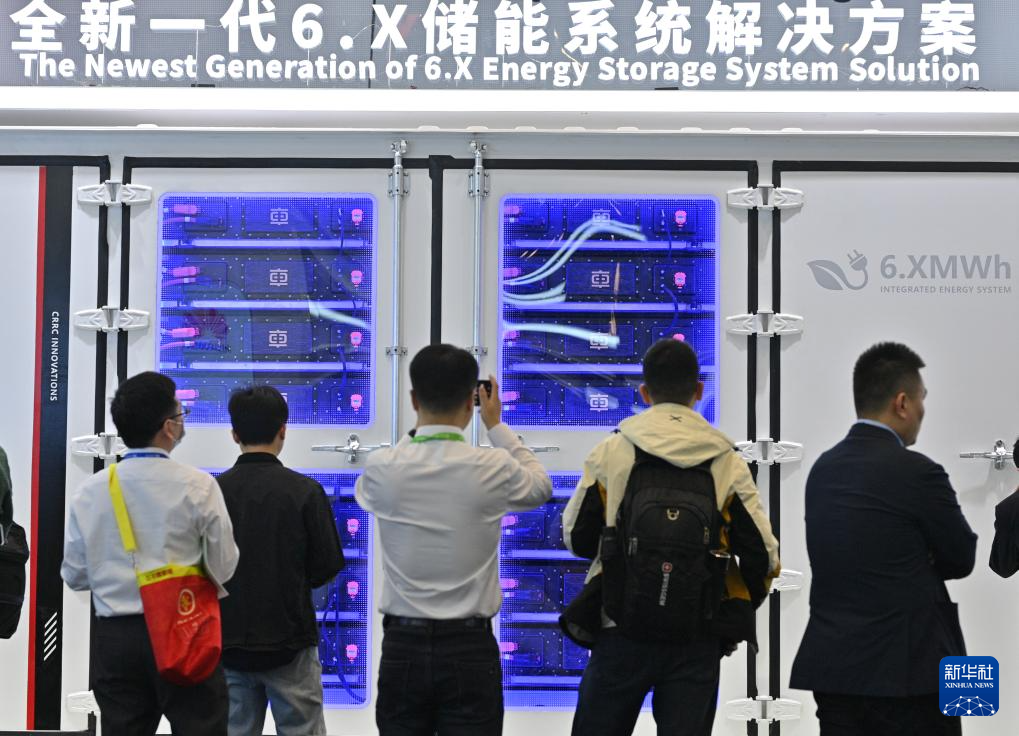 4月11日,参观者在第十三届储能国际峰会暨展览会上了解中国中车展出的全新一代6.X储能系统解决方案。