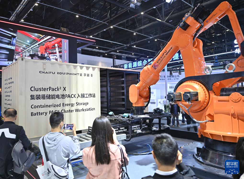 4月11日,参观者在第十三届储能国际峰会暨展览会上了解柴孚机器人展出的集装箱储能电池PACK入簇工作站。
