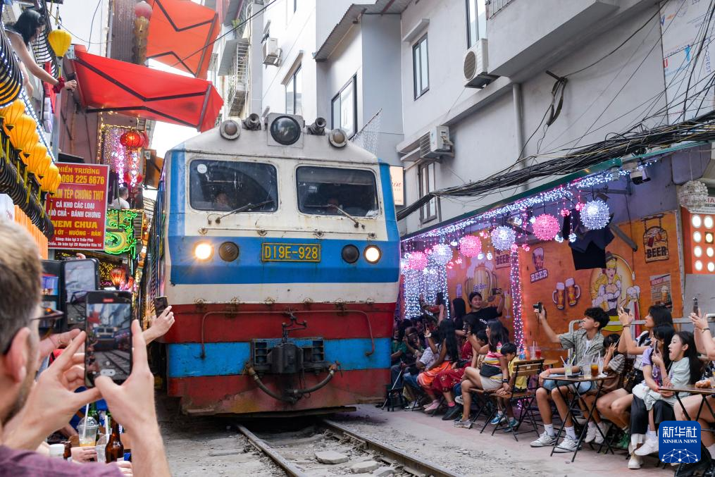 4月13日,在越南首都河内,一列火车经过火车街。