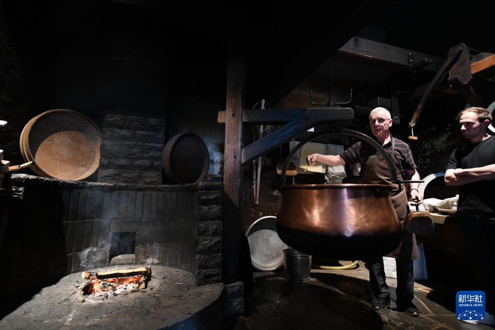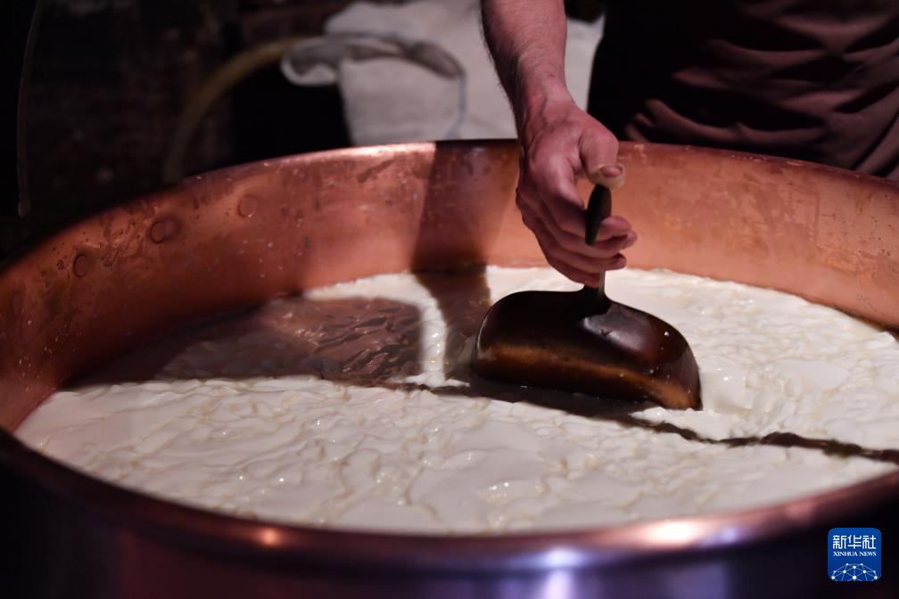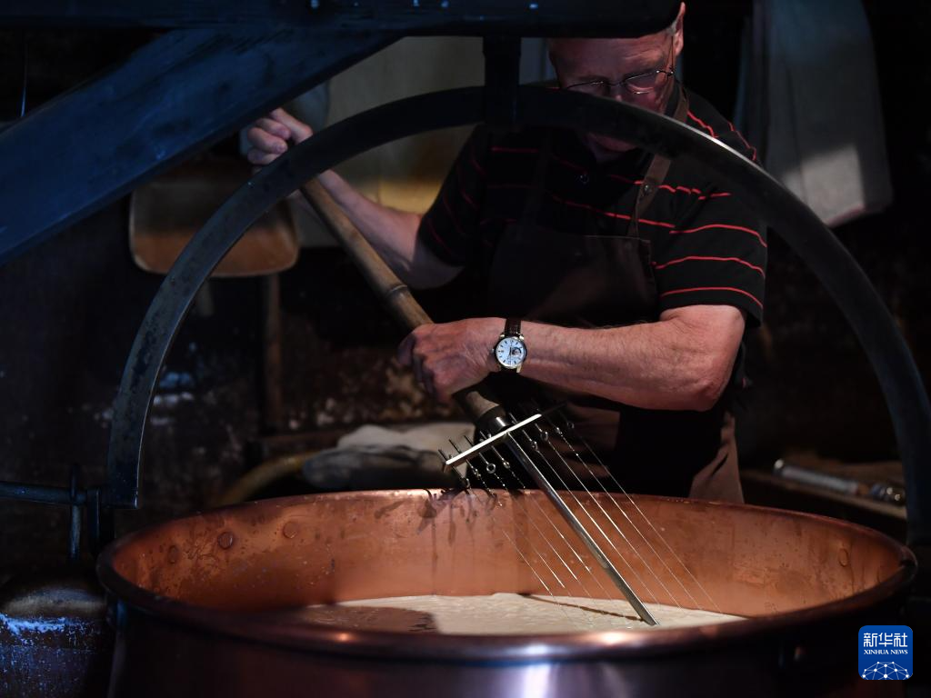4月12日,在瑞士埃默河谷阿福尔特恩,工作人员展示传统奶酪制作流程。