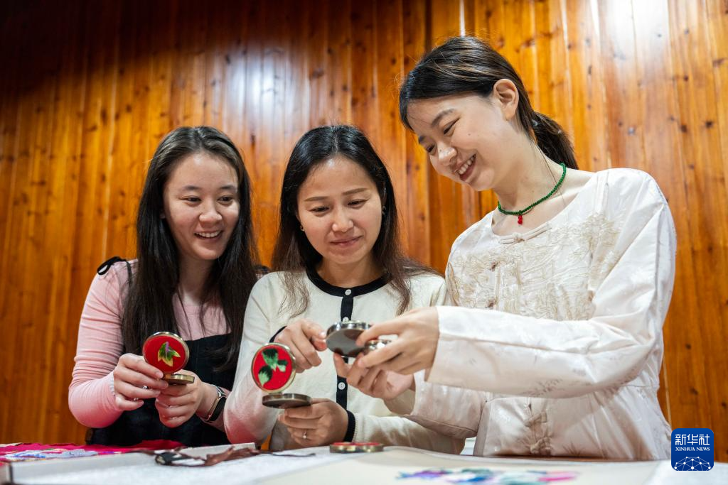 4月16日,在桃源县郑家驿镇梨子岗村齐绘绣庄,肖瑶(右)向游客介绍含有桃源刺绣元素的可折叠化妆镜。