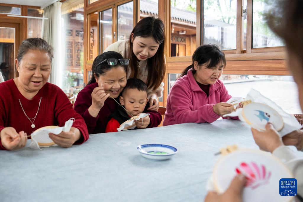 4月17日,在桃源县郑家驿镇梨子岗村齐绘绣庄,肖瑶(右二)带领周边妇女学习刺绣技艺。