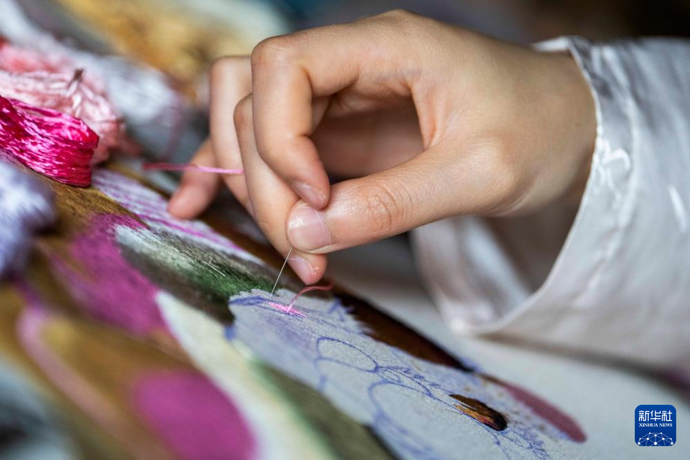 4月16日,在桃源县郑家驿镇梨子岗村齐绘绣庄,肖瑶在进行刺绣创作。
