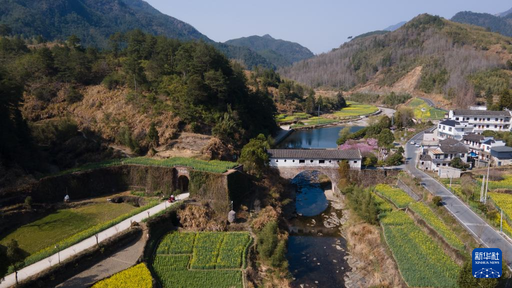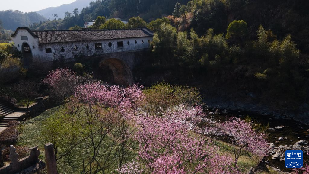 这是2025年4月1日在安徽省黄山市祁门县拍摄的桃源廊桥(无人机照片)。