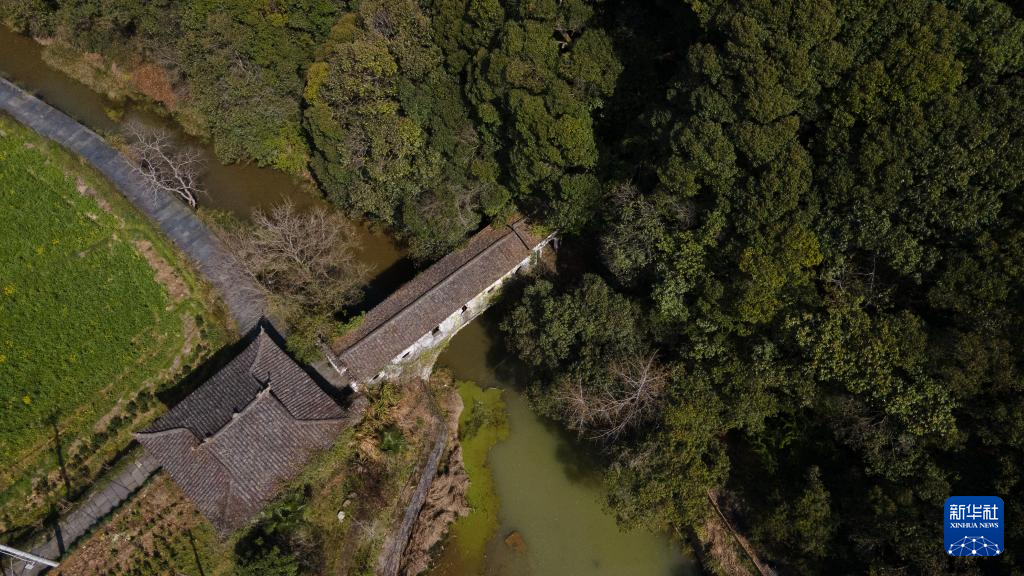 这是2025年3月24日在安徽省黄山市歙县拍摄的水竹坑廊桥(无人机照片)。