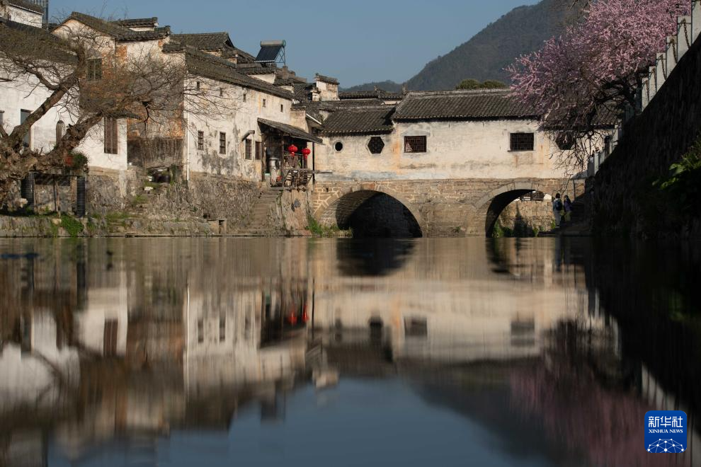 这是2025年3月24日在安徽省黄山市歙县拍摄的北岸廊桥和周边风景(无人机照片,画面下方为北岸廊桥)。