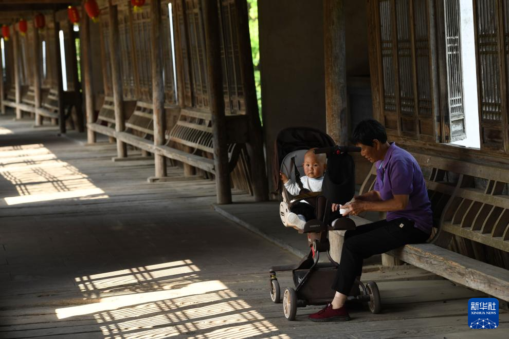 2024年5月15日,当地居民带着孩子在安徽省黄山市休宁县拱北廊桥内休闲。