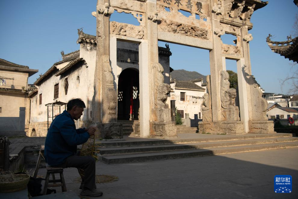2025年3月24日,当地居民张瑞兰老人在安徽省黄山市歙县的北岸廊桥入口处休闲。