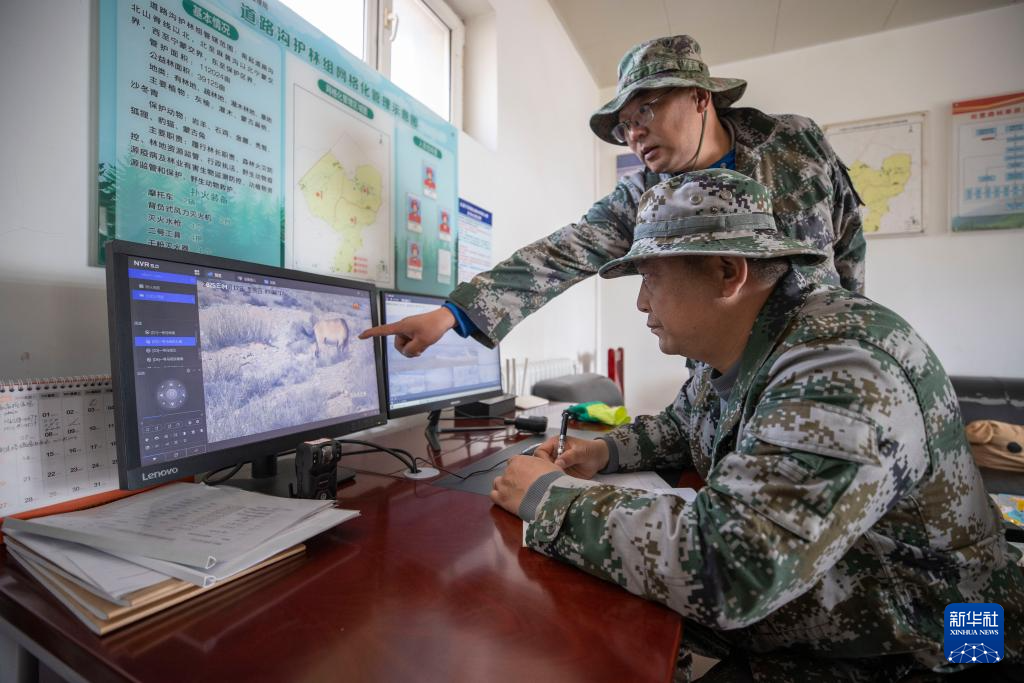 4月17日,宁夏贺兰山国家级自然保护区管理局红果子管理站的工作人员通过监控,查看并记录普氏野马的活动情况。