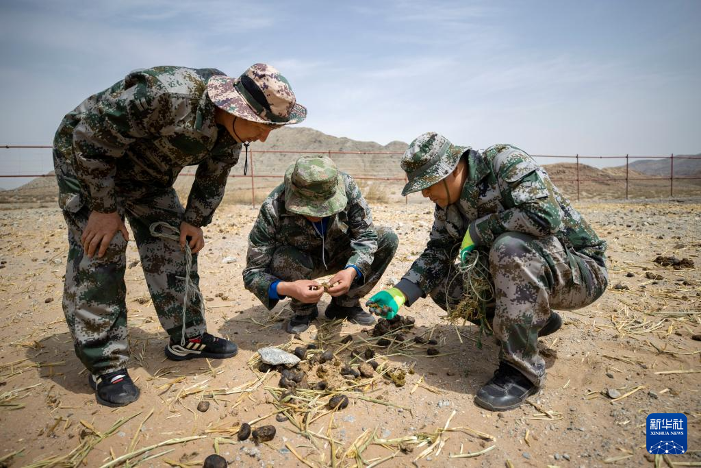 4月17日,宁夏贺兰山国家级自然保护区管理局红果子管理站的工作人员在野外查看普氏野马粪便。