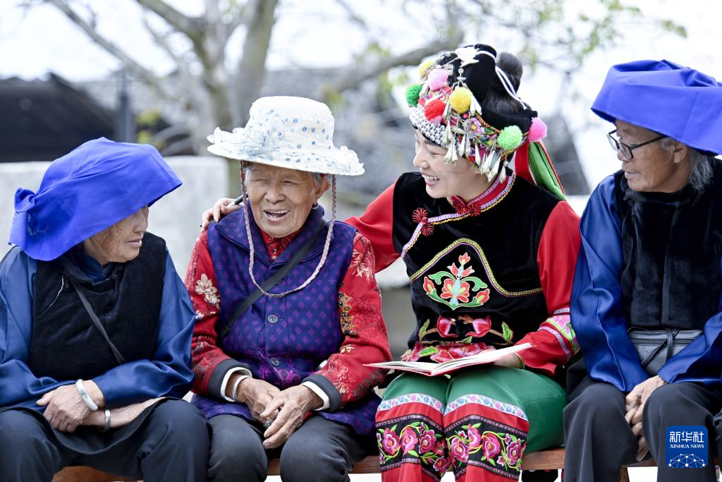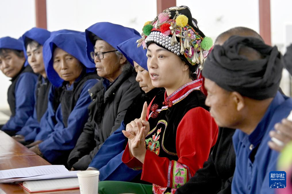 3月18日,鲁丽华在南涧彝族自治县无量山镇新政村给彝族老人们讲解相关养老政策。