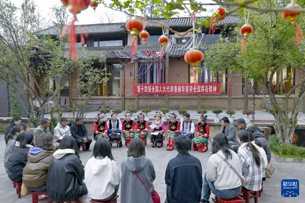 3月18日,鲁丽华在南涧彝族自治县无量山镇新政村幸福小院宣讲两会精神。