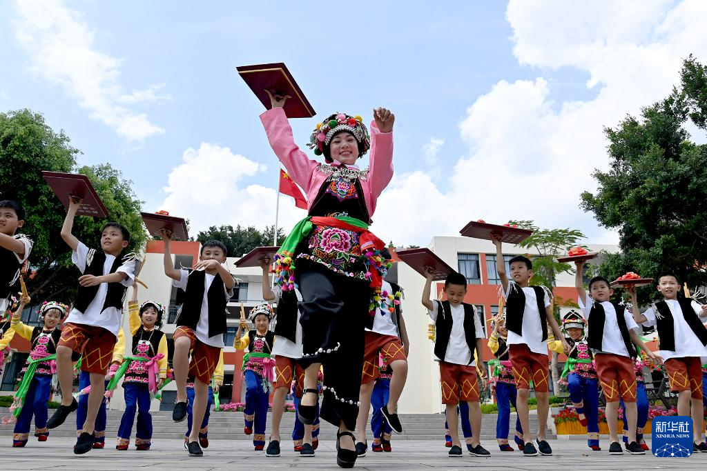 4月17日,在南涧彝族自治县南涧镇第二小学,鲁丽华带领小学生们练习“跳菜”。