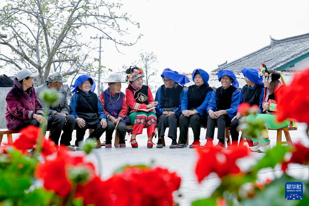3月18日,鲁丽华(右二)在南涧彝族自治县无量山镇新政村幸福小院给彝族群众讲解一老一小相关政策。