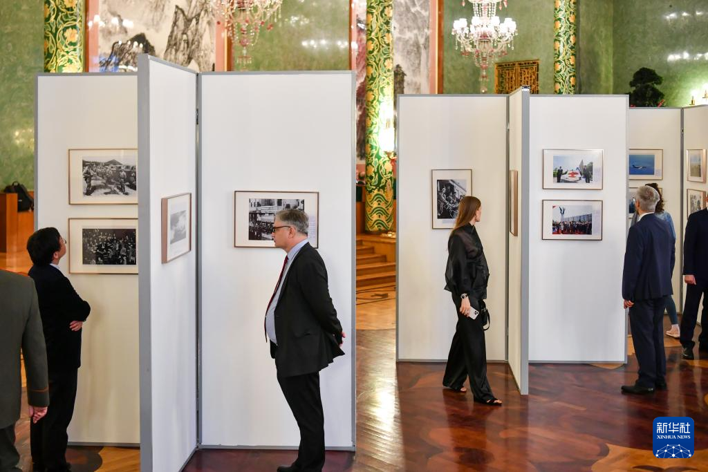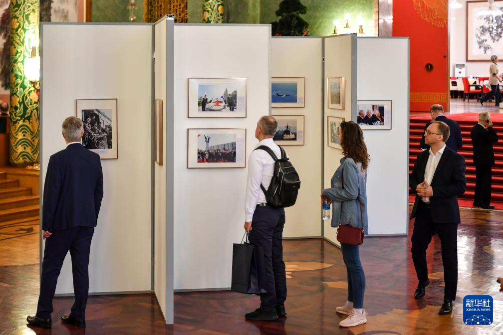 4月18日,在俄罗斯首都莫斯科,嘉宾参观纪念中国人民抗日战争暨世界反法西斯战争胜利80周年图片展。