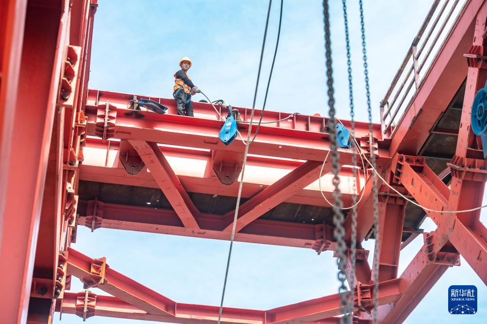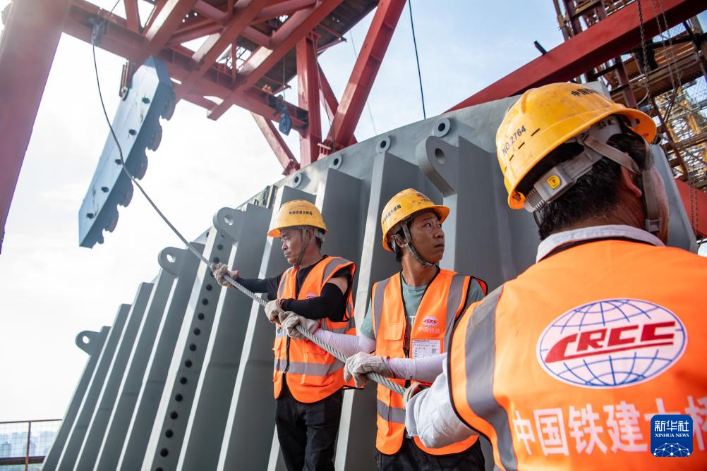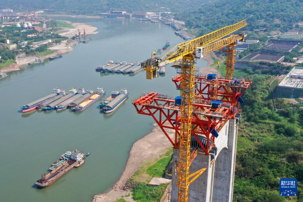 4月19日,在重庆黄桷沱长江大桥建设现场,工人在架设先导索。