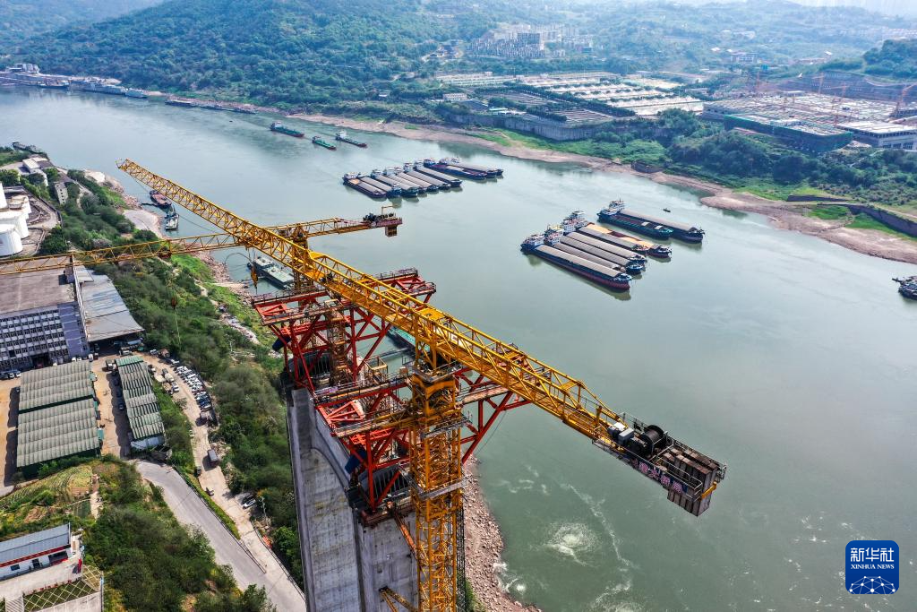 这是4月19日拍摄的重庆黄桷沱长江大桥先导索架设作业现场(无人机照片)。